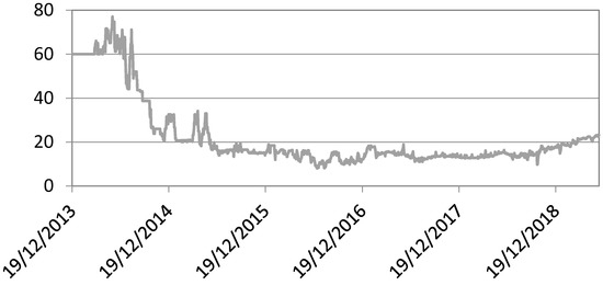 In this formula, is the service-life OLCVBE (unit: Yuan), is the carbon emission coefficient of fossil fuel (unit: kg CO2eq/kg), is the distance-specific fossil fuel consumption of the FFB(unit: kg/km), is the embedded carbon emission coefficient of electric power (unit: kg CO2eq/kWh), is the distance-specific electric power consumption of the BEB (unit: kWh/km), is the annual distance a bus drives (unit: km), is carbon price (unit: Yuan/kg CO2eq), is the termination of the FFB (unit: year), is the termination of the BEB (unit: year), and is the discounted rate of carbon value (unit: none). Formula (16) suggests that the service-life OLCVBE will be affected by the discrepant terminations of battery electric or fossil fuel-powered buses. With different vehicle discarding or replacement policies, FFBs and BEBs will have different terminations, which will impact on the service-life of OLCVBE.