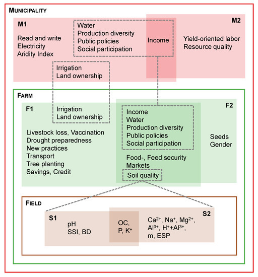 The two regional scale indices are based on the concept of vulnerability, whereas the farm indices assess smallholder resilience and sustainability (Table S1). Nevertheless, there are less thematically overlapping indicators between M1 and M2 than between F1 and F2 and across regional and farm scale (Figure 2). Income is the only overlapping indicator between M1 and M2, but it is calculated from different input data. A decreasing agricultural income causes higher vulnerability due to M2, while M1 results in lower vulnerability when a municipality depends less on smallholder agriculture.