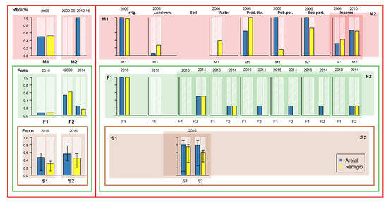Production diversity due to M1 shows high and very high vulnerability for Areial and Remígio. In contrast, the farm scale indices result in much lower vulnerability. Both corresponding indicators of F1 (Crop diversification, Livestock diversification) result in very low vulnerability for both farms. F2 includes in Production diversity all types of agricultural production, resulting in low and very low vulnerability for farm 1 and 2, respectively.