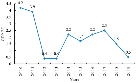 In the second quarter of 2019, the results of industrial production and retail sales of door manufacturing companies in Poland were at the right level. Nevertheless, a decline in sales was noted, which was due to, among other things, visibly faster growth of the costs of labor, outsourced services, and energy spending. As a result, despite the increase in the return on turnover, the return-on-sales ratio decreased. Demand assessments in third quarter of 2019 suggest that the result may be worse than in the previous period. Also, the companies’ domestic demand projections for the fourth quarter have decreased and remain close to the long-term average. According to the representatives of Polish companies, the most important threat to the situation of exporters and importers is the downturn in the German economy. Changes in GDP (gross domestic product) in Germany are presented in Figure 1. Germany’s real GDP growth rebounded tangibly from a near-recession in 2018 to 0.4% in the first quarter of 2019. The projection is to increase by 0.5% in 2019 and by 1.4% in 2020 [28].