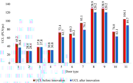 The largest unit labor costs both before and after the introduction of the innovation were for type 8 and 9 doors; i.e., 42 dB technical acoustic doors, whereas the OPAL, AGAT, TBS-type 1 doors had the lowest UCL. After starting the customization line, the UCL values for door types 2, 3, 4 have not changed. In none of the cases analyzed has the cost after the innovation increased, which means that the expected results have been provided.