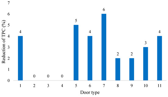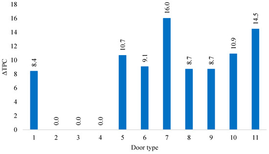 The percentage savings resulting from the reduction in the TPC are not only due to the absolute values of ΔTPC. In principle, they are also affected by the UMC as it has a significant impact on the total TPC value. Therefore, the highest percentage reduction of the TPC was found for door types 7 and 5, of which door type 5 did not have the highest value of the difference between the technological cost before and after the innovation, consisting of launching the TechnoPORTA line.