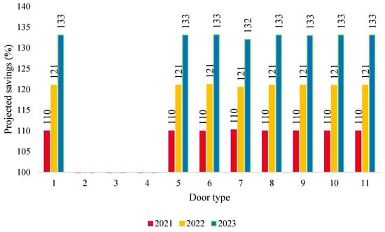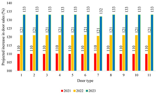 The company’s projections until 2023 foresee a significant increase in sales of the entire product range included in the analysis. A decision was made, therefore, to calculate the total cost reduction (CR) for door production taking into account these projections. This reduction will represent an annual saving resulting from the reduction of the UCL, and thus the TPC for the door types analyzed: