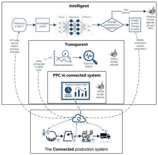 This section presents the developed smart PPC concept and a description of its elements—that is, addressing RQ1. As companies digitalize their manufacturing operations in the move towards industry 4.0, they progress in stages. Schuh et al. [] identified six progressive stages that an operation on the path towards smart manufacturing should follow. These are computerization, connectivity, visibility, transparency, predictive capacity, and adaptability. To simplify, in line with industrial practices, we reclassified the six stages into three—connected, transparent, and intelligent. These three stages, depicted in Figure 2, relate easily to the managers of production systems who seek better tools to improve their ability to respond quickly and accurately to changes in the business environment. A description of the theory behind each stage, the conceptual model and a table of potential use-cases for smart PPC is provided in the subsections below.