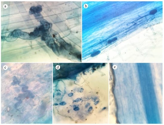 After the rinsing process, the roots were immersed in a 1% HCl solution for 10 min, after which the trypan blue solution staining was made up of 50 parts of glycerol, 50 parts of lactic acid, and 0.05 parts of trypan blue, for 5 min. Stained roots were observed under a microscope at 10×, 40× and 100× magnification.