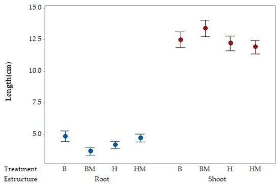 Both the control (B) and the mercury treatment (H) showed an average stem length that was similar, while in the case of the mercury-mycorrhizal (HM) treatments it was the one that showed an average-length minor stem. In the case of roots, the shortest length was observed in the control-mycorrhiza (BM), while in the other treatments the average length was very similar with a very small variation of millimeters between all.