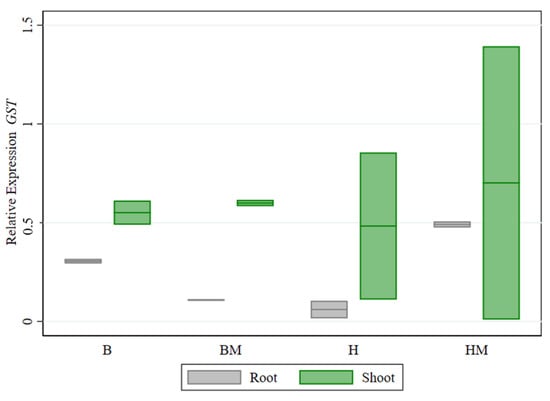 According to the results, it can be inferred that mercury was detoxified by the conjugation of glutathione catalyzed by GST. Consequently, in this study, it can be seen that the activity of the GST protein was blocked, which could have led to an accumulation of unconjugated electrophiles in the cell, or in this case, as expressed by other authors, they can find cytosolic enzymes which could be causing the conversion to toxic metabolites [28,31,58]. In the same way, treatment with mycorrhiza could help the proper development of the plant because a large fraction of the metal is accumulated in the roots and mycelia of arbuscular mycorrhizae, so the elimination of conjugates from the cytoplasm and its compartmentalization and immobilization in the cell is critical for effective detoxification.