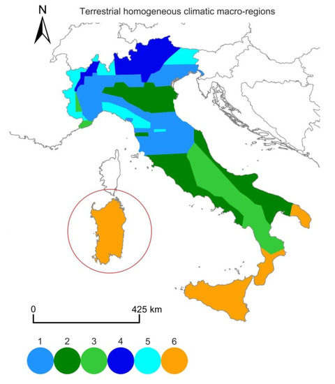 The terrestrial homogeneous climatic macro-regions of the Italian National Climate Change Adaptation Plan. Macro-region 1: Prealps and Northern Apennines; macro-region 2: Pianura Padana, Adriatic upper side, and coastal areas of central-southern Italy; macro-region 3: Central-southern Apennines; macro-region 4: Alpine area; macro-region 5: Northern Italy; macro-region 6: Islands and south of Italy. Sardinia (marked by the red circle) belongs to the macro-region 6. Elaboration of the Authors of the original image retrieved from the Italian NCCAP ([16] (p. 19)). More precise details in the original image.