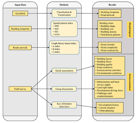 Scholars are now focusing on the spatial forms of informal settlements as key to understanding this sector and developing appropriate management methods [18,19,20,21]. The development of remote sensing (RS) and geographic information system (GIS) technologies has assisted in this quest, and a growing number of studies are using high-resolution RS images [22,23,24]. Researchers have adopted different methods such as object-oriented extraction, space syntax, and spatial metrics, to extract and monitor spatial information for informal settlements and analyze their morphological characteristics [25,26,27,28]. Community-based mapping of the informal settlements has been proven useful for locally-based sustainability planning [29], and urban design could play an important role in addressing the complex challenges faced by informal settlements [30]. Studies showed that informal economic activities in downtown areas have multifaceted contributions to the spatial, social, economic, and environmental aspects of the areas, which is in line with the sustainable livelihood theory [31], but have an adverse effect on the quality of the built environment in residential areas with regard to aesthetic disorder, street trading, traffic jams, visual obstructions, indiscriminate disposal of waste, and land use conversion [32]. These findings are providing useful information for the recognition of informal settlements and the development of poverty elimination, settlement upgrading, and sprawl suppression strategies [33,34,35,36]. Informal settlements occur in both developed and developing cities and are associated with socio-economic, environmental, and administrative factors [37]. Most studies focused on morphological descriptions of informal settlements in a single city [38,39,40]; data regarding the relationship between morphological characteristics and specific socioeconomic functions have not yet been reported. We lack understanding of the impact of informal settlement morphological characteristics on urban development [41]. Comparative studies, combining morphological and functional perspectives, may provide a novel angle to better understand this relationship. Comparative urban studies are a widespread applied research approach across various disciplines that could be used for testing hypotheses against reality and contribute to an inductive discovery of new hypotheses and theory-building [42]. However, such studies are challenged by the need to develop far reaching, useful, and accurate descriptions when applied to other contexts [43]. Although enlightening, the results from these studies may not be applicable everywhere; specific local context must be considered.