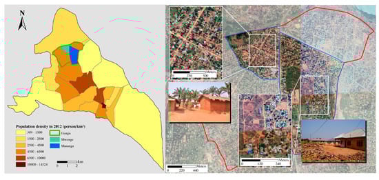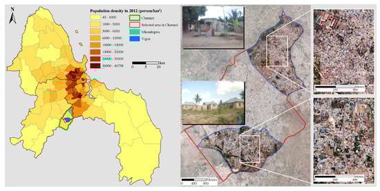 Chamazi belongs to the Temeke municipality in Dar es Salaam, with an area of 27 km2 and an estimated 74,000 inhabitants in 2016. Due to its size, only part of it was selected as the research area. The population data were obtained from the ward executive officer of Chamazi. Two sub-wards, Mkondogwa and Vigoa, were selected to compare socioeconomic development differences in areas with differing building densities (Figure 3).