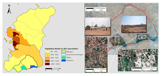 Buhongwa is located in Nyamagana municipality, Mwanza. It has an area of 45 km2 and an estimated 37,000 inhabitants based on 2016 data. The population data were obtained from the ward executive officer of Buhongwa. Due to its large size, part of the settlement was selected as the research area. With an average annual population growth rate of 8.3%, it is the fastest growing ward in Mwanza. Shibayi and Mitimilefu sub-wards, which have different building densities, were selected for study (Figure 4). According to the actual situation of the investigation, the Shibayi sub-ward was outside of the area we selected, but this should have no influence on our analysis.