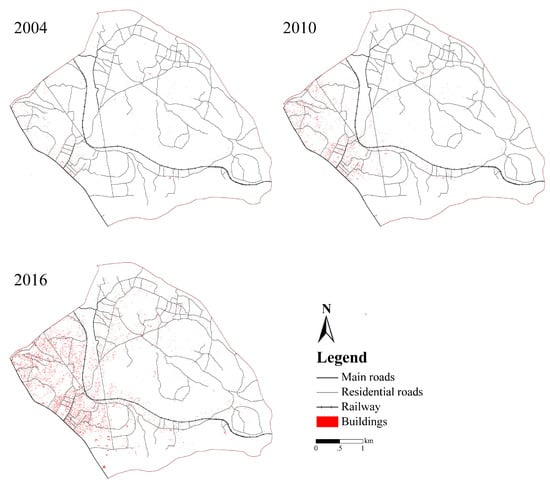 Spatial distribution of buildings in Buhongwa from 2004 to 2016.