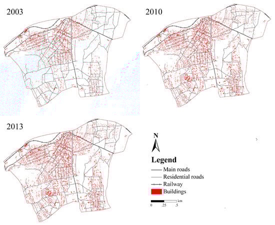 Spatial distribution of buildings in Gungu from 2003 to 2013.