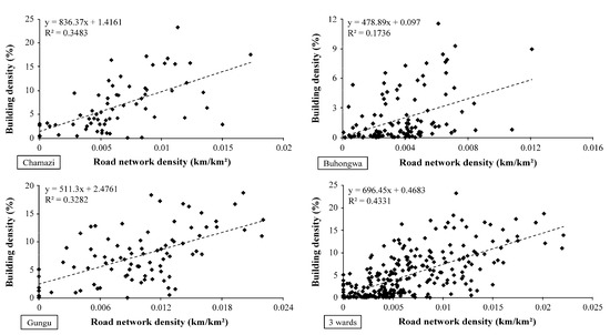 Figure 9. Scatter diagram of the relationship between building density and road network density. - (2)