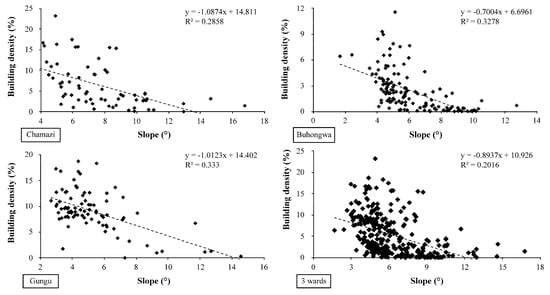 - The results showed that building density decreased with increases in slope (Figure 10). Many of the buildings in informal settlements were constructed ignoring slope conditions. The total area and average number of buildings with a slope of more than 15 degrees were largest in Chamazi, followed by Buhongwa and Gungu. Floods and landslides are significant environmental problems in these settlements. The demolition and reconstruction of residential areas have also caused difficulties.