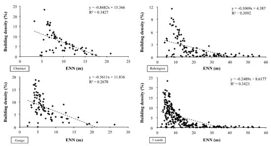 Figure 11. Scatter diagram of the relationship between building density and Euclidean nearest-neighbor (ENN). - (4)