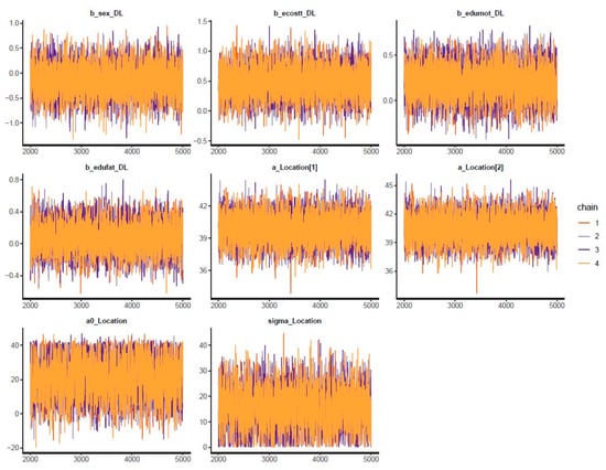 The results of the Digital Literacy model are shown in Table 2. The model is verified using the MCMC method, and the chains are shown in Figure 2. Overall, all the chains are resembled, suggesting the autocorrelation phenomenon. Rhat is around 1 (more than 1.1 means problem), and n_eff is above 2000 (more than 1000 means good sign). From Figure 2, we can see that the convergence of our model is good.