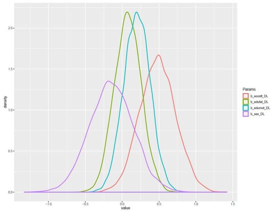 Figure 3 displays the density and value of SES status, gender, mothers’ education level, and fathers’ education level to students’ digital literacy. The SES status has a positive association with the level of students’ digital literacy (mean = 0.48). The distribution of b_edumot_DL (mean = 0.2) and b_edufat_DL (mean = 0.08) are narrow with a high density, which indicates a firm association between the parents’ education and students’ digital literacy (the mother’s education has more impact than the father’s). The ‘sex’ coefficient lies in the negative zone of Figure 3 value’s bar (mean = −0.15), which represents a weak association between students’ gender and the students’ digital literacy (girls’ digital literacy is slightly higher than boys’).