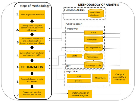The hypothesis of the present study was that replacing the current traditional public transport system with a demand responsive transport system can enhance the level of service both for the users and the providers. A universally applicable seven-step process was set up, which can be used to optimize the traffic system or only a part of a traffic system.