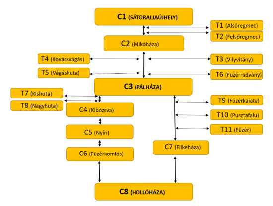 Using the above-described comprehensive methodology, the bus lines serving the following settlements in northeastern Hungary were analyzed: (i) Sátoraljaújhely–Kovácsvágás–Pálháza–Nagyhuta–Hollóháza (line 3900) and (ii) Sátoraljaújhely–Kovácsvágás–Pálháza–Nagyhuta–Nyíri–Hollóháza (line 3901). All links serving this area use the main route Sátoraljaújhely–Mikóháza–Pálháza–Filkeháza/(Kisbózsva–Nyíri–Füzérkomlós)–Hollóháza, and they serve the surrounding ‘dead-end villages’ by detours scheduled in their timetables (Figure 2). For convenience, the different settlements’ names were replaced by codes.