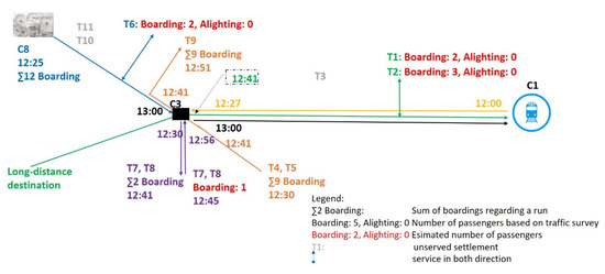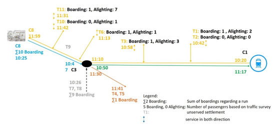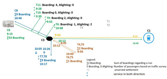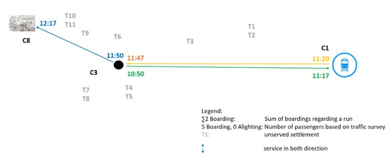 An analysis of the passenger counts provided by the Operator (the survey covers 10 days: 26 September 2019–05 November 2019) reveals that in the off peak hours the demand from settlements with less than 55 inhabitants can be served by minibuses, as the number of passengers does not exceed 8 persons per departure (Figure 3, Figure 4, Figure 5 and Figure 6). Although T4 has a higher number of residents than the 500 threshold, the mobility needs do not differ significantly from those of smaller villages (Figure 3, Figure 4, Figure 5 and Figure 6). In Figure 3, Figure 4, Figure 5 and Figure 6, the values given in the form ∑x give the sum of people travelling on the given bus.