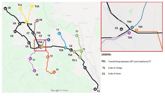 The suggested traffic system based on the optimization process is illustrated in Figure 7. The black line depicts the traditional main route of traffic, while the DRT lines are depicted in different colors. As the figure shows, one vehicle can serve more than one settlement. The DRT service to replace traditional service can be accessed from the existing stops on the main route. Six transfer stops (TS) were defined for the 11 ‘dead-end villages’.
