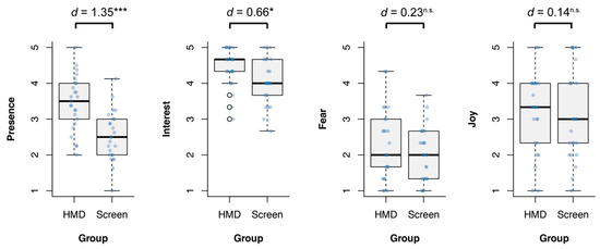 The largest differences were found for the variable of presence, which differed between the HMD group and the screen group with a large effect size (Z = −3.954, d = 1.35, p < 0.001). In comparison, the participants within the immersive HMD group showed a significantly higher interest with a medium effect size (Z = −2.197, d = 0.66, p < 0.05). However, there were no significant differences between the groups in the emotions of fear (Z = −0.821, d = 0.23, p > 0.05) and joy (Z = −0.480, d = 0.14, p > 0.05). Figure 1 illustrates the distributions of, and differences between, the dependent variables presence, interest, fear, and joy in the two experimental groups.