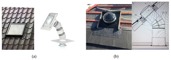 All the houses are of similar dimensions and plans (Figure 3), half with a roof pitch oriented to the south, the other half with a roof pitch oriented to the north. The shape and pitch of the roof has been identified as a key factor when dealing with use of sunlight in buildings [20], so the selected houses have identical types of roof. Each house has two light pipes: one in the first-floor bathroom, the other one above the staircase landing (Figure 3).