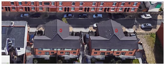 Aerial view of the roofs of the semi-detached houses (in Moss Side, Manchester, UK. Source: Google Earth) with light pipes (red circles) of the same orientation but different apertures.