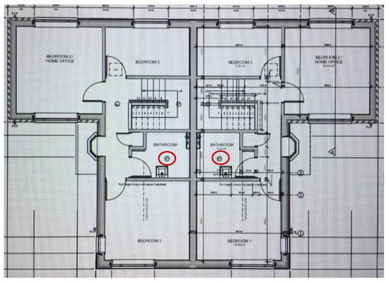 Identical plans of the first floor of the twin houses with similar light pipes in the bathrooms (red circles). Plans provided by Mosscare Housing Association.