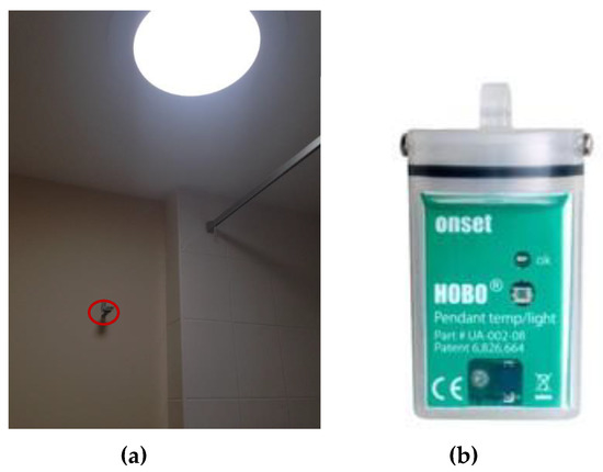 The height of the light pipe diffusers in the two bathrooms is 2.40 m from floor to ceiling, and the floor area of each bathroom is 4.22 m2. Illuminance measurements were taken with HOBO light data loggers that were installed in identical places in the houses (Figure 4) at 2.00 m from the floor. This arrangement prevents the data loggers from impairing the usual activities in the bathrooms. Given the low height of the ceiling and the high reflectance of the walls in the bathrooms considered in this work, a similar illuminance is expected at the vertical plan of the mirrors and eye of the users.