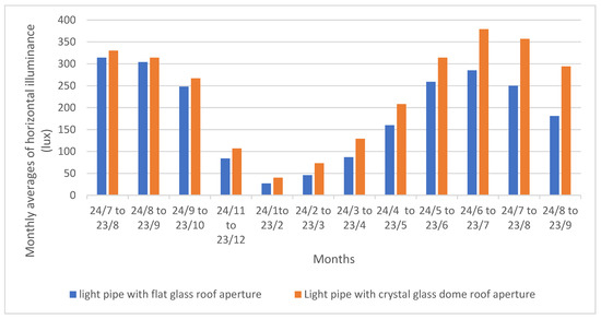 Monthly average illuminance recorded for two light pipes: flat glass versus crystal dome aperture.