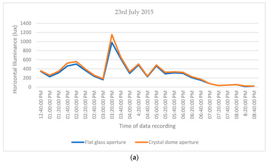 (a) Recorded Illuminance on 23rd July 2015 and (b) on 13th July 2016 for the two types of apertures.