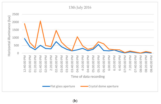 A first glance at the figures above shows that the difference in both the weekly (Figure 5) and monthly (Figure 6) averages of recorded illuminance of the two types of apertures for the light pipes tends to systematically increase with time and is quite marked after one year of measurements; that is, the light pipe with the crystal glass dome aperture consistently outperforms the one with a flat aperture. This difference in performance is more marked in the summer months after almost one year. Figure 7a,b shows the remarkable lower illuminance during peak hours of the flat glass aperture in the months of July 2016 compared to July 2015. In the same way, the illuminance in the light pipe, the collecting system of which is a glass dome, is even higher in 2016 (due to meteorological conditions) and remains even much higher than in the case of the flat aperture.