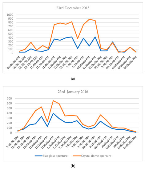 During the winter months of December 2015 and January 2016, when the sun was low in the sky, the crystal domed light pipe had an increase in performance that exceeded 100% over that of the light pipe with the flat glass aperture as illustrated in Figure 8a,b. This clearly illustrates that the configuration of the crystal glass dome, with its higher capability of intercepting low incidence light has a major impact on higher illuminance afforded during winter, when it is mostly needed.
