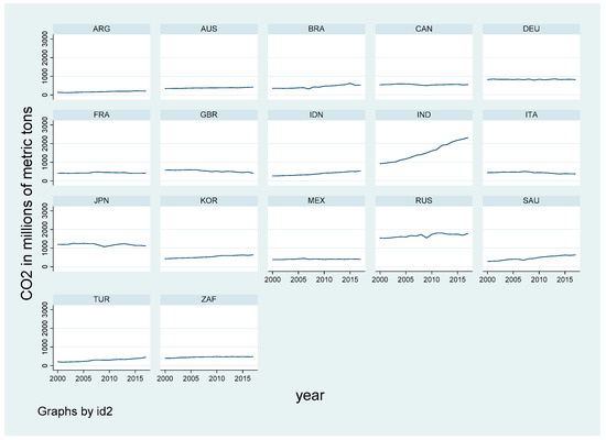 Country level data on CO2 emissions, GDP, population (POP), and energy usage (E) are required for the analysis. Data on GDP (real GDP in millions of 2011 US dollars: gdpna) and population (in millions) come from the Penn World Tables (PWT 9.1) [51]. Data on CO2 emissions (MMtons) from the consumption of energy and energy consumption (Quad Btus) come from the United States Energy Information Agency (US EIA) [52]. CO2 emissions from the consumption of energy include emissions that result from the consumption of petroleum, natural gas, and coal and from natural gas flaring. Total energy consumption includes coal, natural gas, petroleum and other liquids, nuclear, renewables and other. The 19 countries included in the study are Argentina, Australia, Brazil, Canada, China, France, Germany, India, Indonesia, Italy, Japan, South Korea, Mexico, Russia, Saudi Arabia, South Africa, Turkey, Great Britain, and the United States. These 19 countries along with the European Union form the group of countries known as the G20. The data set covers the years 2000–2017.