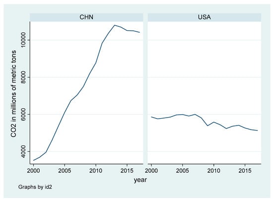 CO2 emissions for most of the countries show a relatively flat pattern between 2000 and 2017 (Figure 1). Some countries like India experienced a large increase in emissions over the time period. China experienced a huge increase in emissions up to 2013 (10,800 million tonnes of CO2), after which emissions declined due in part to changes in economic structure (Figure 2) [53]. US carbon emissions peaked at just about 6000 million tonnes of CO2 in 2007 and have been experiencing a steady decrease in emissions since then due to fuel switching in power generation (coal to natural gas and renewables) and a decrease in industrial fuel use (Figure 2).