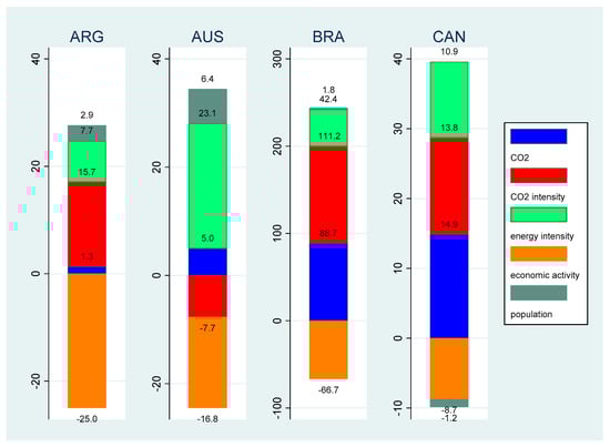 Figure 3 presents a graphical comparison of the difference in post-financial crisis and pre-financial crisis results from Table 3 for Argentina, Australia, Brazil and Canada. For each country, the 2007 values for each decomposition factor are subtracted from their respective 2017 values to determine which factor exhibited the greatest change between the two subperiods. For Argentina, the biggest factor was the decrease in economic activity. For Australia, the biggest factor was an increase in energy intensity. For Brazil and Canada, the biggest factor was an increase in carbon intensity.