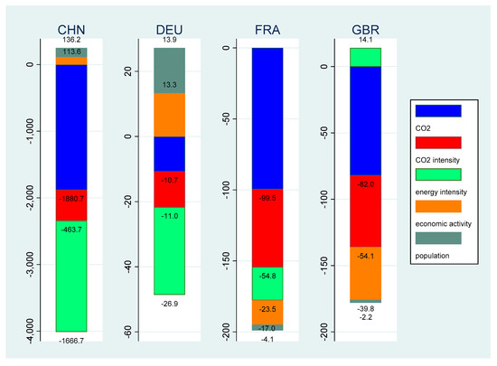 Difference in post-financial crisis and pre-financial crisis additive decomposition (MMtons) for China, Germany, France, and Great Britain.