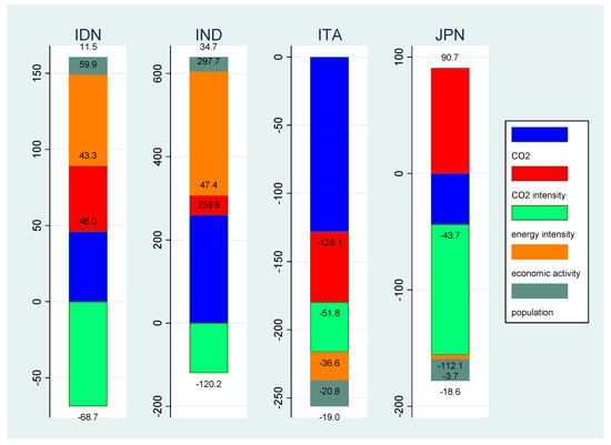For most countries, the largest contributor to CO2 emission rates of change in the post-recession period was economic activity (13 countries) or population (5). Japan is the outlier, because the largest contrition to CO2 emission rates of change comes from carbon intensity. This is due to how the 2011 Fukushima nuclear disaster altered the energy supply in Japan [57,58,59]. The Japanese nuclear power sector was shut down in 2012, but some reactors have been allowed to come back online since then. For 16 countries, the smallest contributor to CO2 emission rates of change was energy intensity.