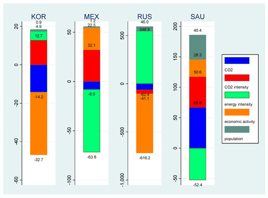 For China and Germany, the biggest factor was a decrease in energy intensity. For France and Great Britain, the biggest factor was a decrease in carbon intensity (Figure 4). For Indonesia, the biggest factor was a decrease in energy intensity (Figure 5). For India, the biggest factor was an increase in economic activity. For Italy, the biggest factor was a decrease in carbon intensity. For Japan, the biggest factor was a decrease in energy intensity. For South Korea, the biggest factor was a decrease in economic activity (Figure 6). For Mexico, the biggest factor was a decrease in energy intensity. For Russia, the biggest factor was an increase in energy intensity and for Saudi Arabia the biggest factor was a decrease in energy intensity. For Turkey, the biggest factor was an increase in economic activity (Figure 7). For the USA, the biggest factor was a decrease in carbon intensity. For South Africa, the biggest factor was a decrease in economic activity. In summary, when looking at the change in decomposition factors between the post-financial crisis and pre-financial crisis periods, carbon intensity was the most important factor affecting changes in carbon dioxide emissions for six countries, energy intensity was the most important factor for seven countries and economic activity was the most important factor for six countries.