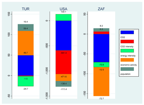 Difference in post-financial crisis and pre-financial crisis additive decomposition (MMtons) for Turkey, the USA, and South Africa.