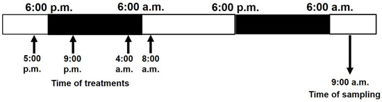 Leaves of soybean and ragweed plants were sprayed with Basagran® herbicide solution (BASF, Ludwigshafen, Germany) diluted in double-distilled water to a final concentration of 720 or 1440 g ha−1 of active ingredient bentazon (3-isopropyl-1H-2,1,3-benzothiadiazin-4(3H)-one 2,2-dioxide). To investigate the daytime- or night-time- and light-dependent effects of different concentrations of bentazon, plants were treated at several times, such as in the late afternoon (5:00 p.m.), in the evening (9:00 p.m.), at dawn (4:00 a.m.) and in the morning (8:00 a.m.) [37]. Plant responses were detected at 9:00 a.m. in the second light phase of the day after each treatment (Figure 1). As a control treatment, spraying with double-distilled water was used in all times, the results of which were averaged.