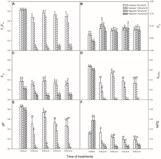 Changes in the chlorophyll a fluorescence parameters (Fv/Fm (A); F0 (B); Fm (C); фPSII (D); qP (E); NPQ (F)) in leaves of soybean (white columns) and common ragweed plants (grey columns) treated foliar with 720 or 1440 g ha−1 bentazon at different times (at the end of light cycle (5:00 p.m.), at night (9:00 p.m.), at dawn (4:00 a.m.) and in the morning (8:00 a.m.)). Measurements were disposed of in the morning at the second light phase of the day (9:00 a.m.) after the treatments. Means ± SE, n = 3. Means marked with different letters are significantly different at p ≤ 0.05 as determined by Tukey’s test (upper case letters show the different effects in soybean and lower case letters show the different effects in common ragweed plants).