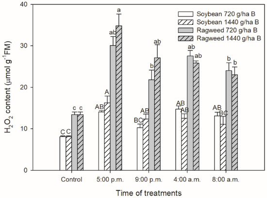 Changes in the H2O2 content in leaves of soybean (white columns) and common ragweed plants (grey columns) treated foliar with 720 or 1440 g ha−1 bentazon at different times (at the end of light cycle (5:00 p.m.), at night (9:00 p.m.), at dawn (4:00 a.m.) and in the morning (8:00 a.m.)). Measurements were disposed of in the morning at the second light phase of the day (9:00 a.m.) after the treatments. Means ± SE, n = 3. Means marked with different letters are significantly different at p ≤ 0.05 as determined by Tukey’s test (upper case letters show the different effects in soybean and lower case letters show the different effects in common ragweed plants).