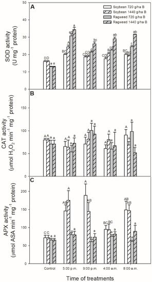 Changes in the activity of superoxide dismutase (SOD; A), catalase (CAT; B) and ascorbate peroxidase (APX; C) in leaves of soybean (white columns) and common ragweed plants (grey columns) treated foliar with 720 or 1440 g ha−1 bentazon at different times (at the end of light cycle (5:00 p.m.), at night (9:00 p.m.), at dawn (4:00 a.m.) and in the morning (8:00 a.m.)). Measurements were disposed of in the morning at the second light phase of the day (9:00 a.m.) after the treatments. Means ± SE, n = 3. Means marked with different letters are significantly different at p ≤ 0.05 as determined by Tukey’s test (upper case letters show the different effects in soybean and lower case letters show the different effects in common ragweed plants).