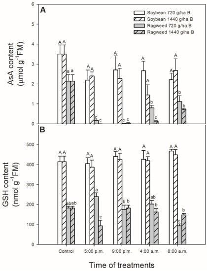 Changes in the ascorbate (AsA; A) and glutathione (GSH; B) content in leaves of soybean (white columns) and common ragweed plants (grey columns) treated foliar with 720 or 1440 g ha−1 bentazon at different times [at the end of light cycle (5:00 p.m.), at night (9:00 p.m.), at dawn (4:00 a.m.) and in the morning (8:00 a.m.)]. Measurements were disposed of in the morning at the second light phase of the day (9:00 a.m.) after the treatments. Means ± SE, n = 3. Means marked with different letters are significantly different at p ≤ 0.05 as determined by Tukey’s test (upper case letters show the different effects in soybean and lower case letters show the different effects in common ragweed plants).