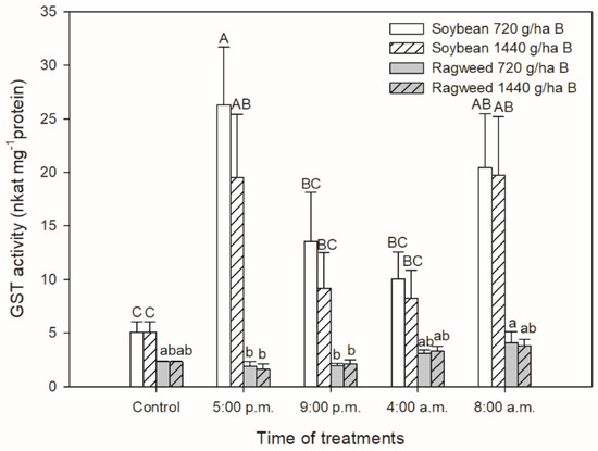Changes in the glutathione S-transferase (GST) activity in leaves of soybean (white columns) and common ragweed plants (grey columns) treated foliar with 720 or 1440 g ha−1 bentazon at different times (at the end of light cycle (5:00 p.m.), at night (9:00 p.m.), at dawn (4:00 a.m.) and in the morning (8:00 a.m.)). Measurements were disposed of in the morning at the second light phase of the day (9:00 a.m.) after the treatments. Means ± SE, n = 3. Means marked with different letters are significantly different at p ≤ 0.05 as determined by Tukey’s test (upper case letters show the different effects in soybean and lower case letters show the different effects in common ragweed plants).