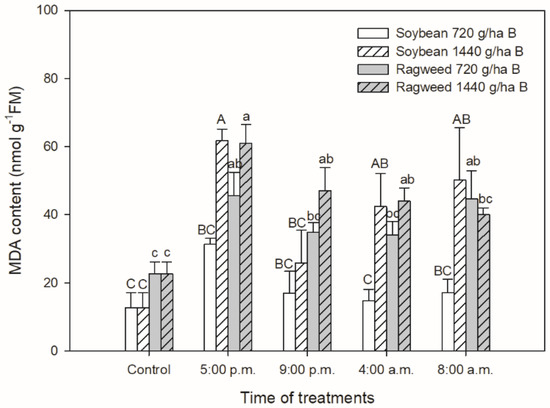 Changes in the malondialdehyde (MDA) content in leaves of soybean (white columns) and common ragweed plants (grey columns) treated foliar with 720 or 1440 g ha−1 bentazon at different times (at the end of light cycle (5:00 p.m.), at night (9:00 p.m.), at dawn (4:00 a.m.) and in the morning (8:00 a.m.)). Measurements were disposed of in the morning at the second light phase of the day (9:00 a.m.) after the treatments. Means ± SE, n = 3. Means marked with different letters are significantly different at p ≤ 0.05 as determined by Tukey’s test (upper case letters show the different effects in soybean and lower case letters show the different effects in common ragweed plants).