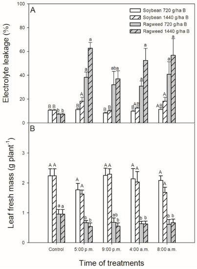 Changes in the electrolyte leakage (EL; A) and leaf fresh mass (B) of soybean (white columns) and common ragweed plants (grey columns) treated foliar with 720 or 1440 g ha−1 bentazon at different times (at the end of light cycle (5:00 p.m.), at night (9:00 p.m.), at dawn (4:00 a.m.) and in the morning (8:00 a.m.)) after one week. Measurements were disposed of in the morning at the second light phase of the day (9:00 a.m.) after the treatments. Means ± SE, n = 3. Means marked with different letters are significantly different at p ≤ 0.05 as determined by Tukey’s test (upper case letters show the different effects in soybean and lower case letters show the different effects in common ragweed plants).